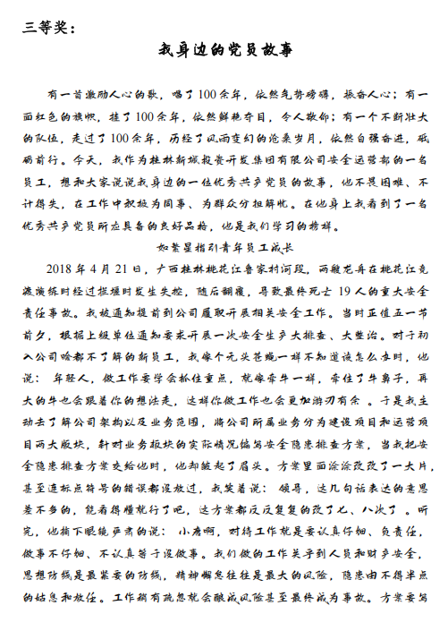 為確保比賽的專業(yè)性與公正性,集團(tuán)黨委聯(lián)合第三黨支部委員及群眾代表組成評(píng)審小組,從主題性、感染力、文字表達(dá)、創(chuàng)新性四個(gè)維度對(duì)作品進(jìn)行綜合評(píng)分。經(jīng)過層層篩選,最終評(píng)選出一等獎(jiǎng)2名、二等獎(jiǎng)1名、三等獎(jiǎng)3名、優(yōu)秀獎(jiǎng)5名。獲獎(jiǎng)作品既有對(duì)黨員先進(jìn)事跡的深度刻畫,也有對(duì)黨性精神的深刻詮釋,充分反映了參賽者的真情實(shí)感與創(chuàng)作水平。