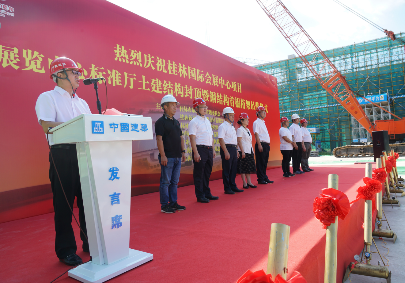 7月13日,桂林國際會展中心項目展覽中心標(biāo)準(zhǔn)廳土建結(jié)構(gòu)封頂暨鋼結(jié)構(gòu)首榀桁架吊裝儀式圓滿舉行。